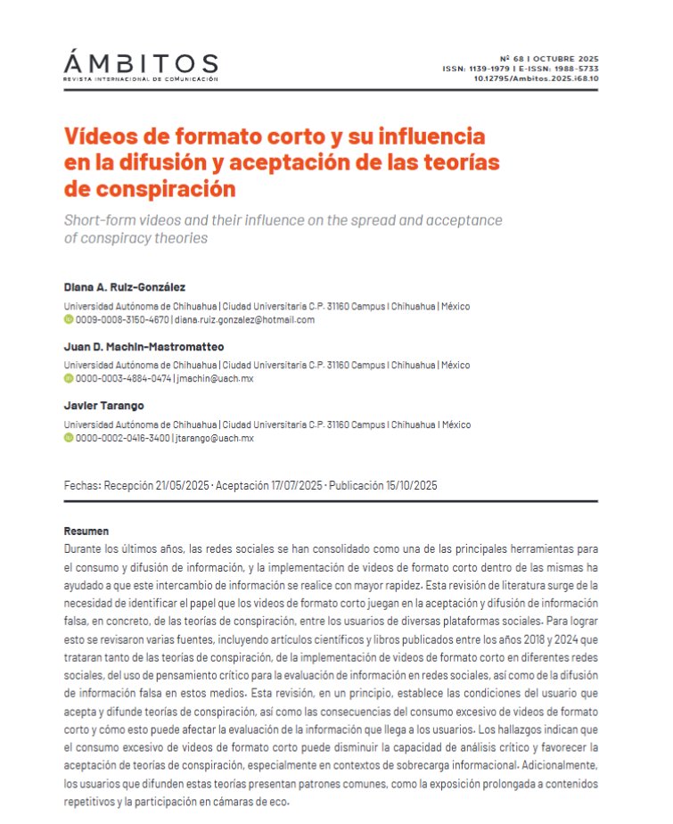 Ruiz-González, D. A., Machin-Mastromatteo, J. D., y Tarango, J. (2025). Vídeos de formato corto y su influencia en la difusión y aceptación de las teorías de conspiración. Ámbitos. Revista Internacional de Comunicación, (68), 186-200. https://doi.org/10.12795/Ambitos.2025.i68.10