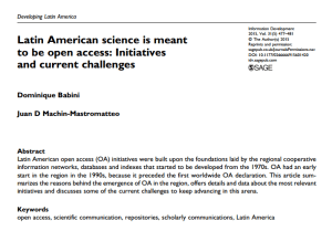 On the past issue of Information Development (IDV) (Published November 2014), we had to part ways with and wish our best to our fellow Editorial Advisory Board Member (EABM) Archie Dick and his column African Information Initiatives. Some months ago, IDV Editor asked EABM for ideas on a new regular column. For me, the prospect of being in charge of a new column was very attractive from the beginning and I had a clear idea to propose: if we had a column about Africa, then the most logical choice is to continue with a column about Latin America (LA). Before making my suggestion, I knew that writing a column for every IDV issue involves a huge challenge: have the discipline of writing something interesting while keeping up with the journal’s deadlines. However, it could be a very important achievement as the proposed column’s debut would coincide with IDV’s 30th anniversary. Moreover, it is an outstanding opportunity for me as a scholar, in order to be able share some thoughts and concerns in the personal and pleasing, but didactic format of an ongoing opinion column. Furthermore, this gives me the chance to deepen my own understanding about some topics that are strategic to the region before writing the lines you will read on the next issues. Hence, Developing Latin America was my proposal, which was accepted and encouraged by our Editor and my fellow EABM, for which I am very thankful.